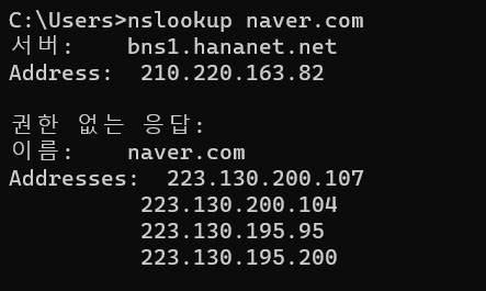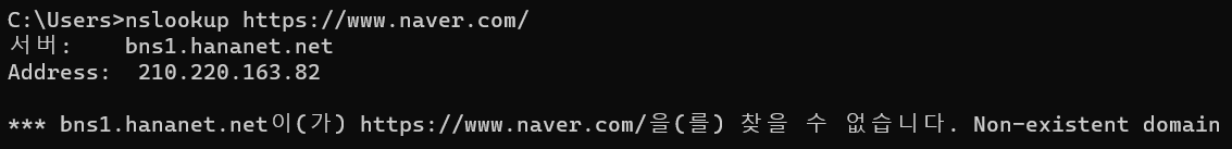 만약 nslookup https://www.naver.com/ 같이 전체 주소를 입력하면 Non-existent domain... 이 뜬다.