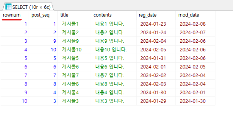 rownum을 이용하면 post_seq이 불규칙한 상태에서도 원하는 post_seq의 앞, 뒤 행의 값을 가져올 수 있다.