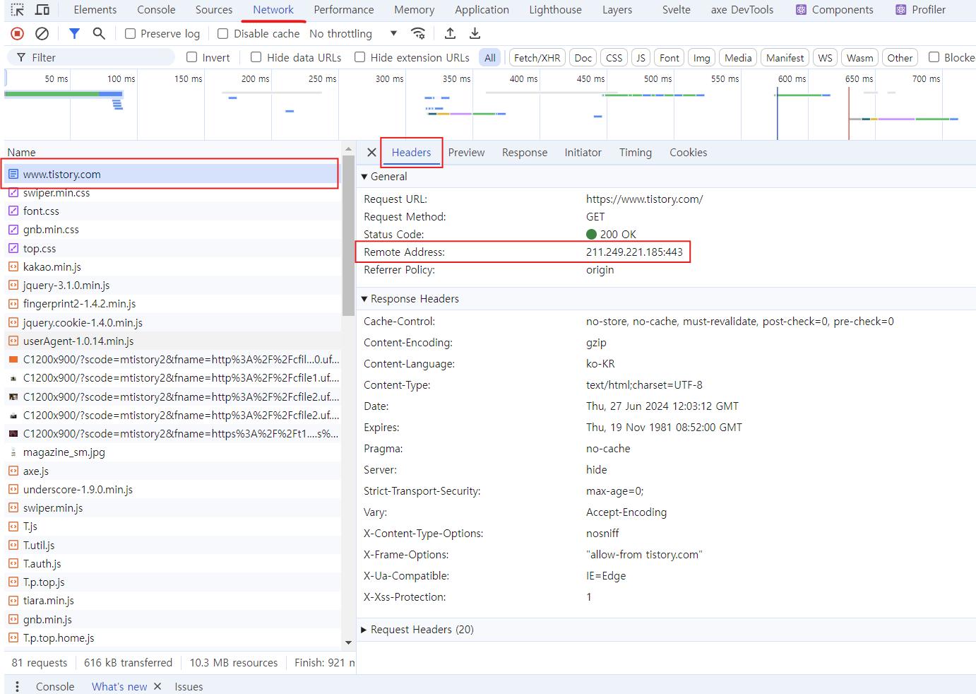 2. 키보드 F12를 눌러 개발자도구 열기 - [Network] 탭 - [Headers] - Remote Address 확인