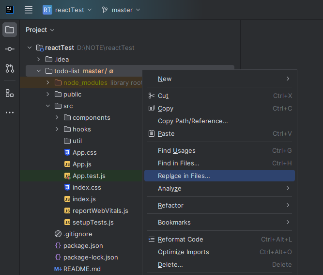 1. 치환을 적용하려는 최상위 폴더에서 오른쪽 클릭 → [Replace in Files] 선택